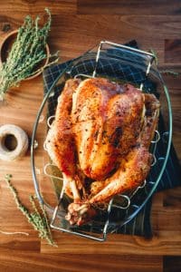 Use an instant-read thermometer in the thickest part of the thigh without touching the bone. The juices should run clear, and the internal temperature should reach 165°F in both the breast and thigh. Keep in mind that residual heat continues to cook the turkey while it rests, so pulling it from the oven at 160°F can be ideal.