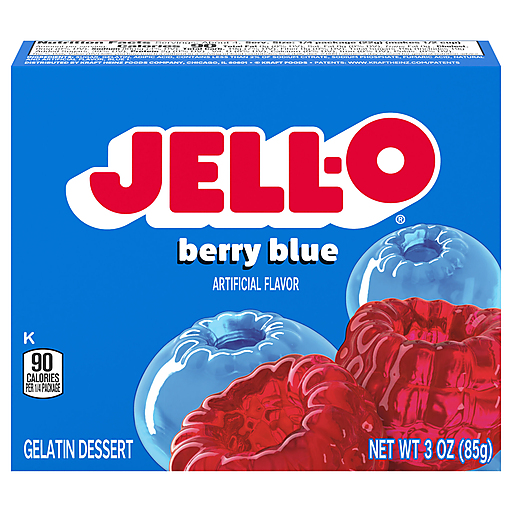 Snack happy. Jell-O Berry Blue Artificially Flavored Gelatin Dessert Mix lets you add some wonder to your day with a convenient snack. Spoon up a smile with our artificially flavored berry blue Jell-O gelatin that contains 90 calories per serving. Our colorful, jiggly treat is perfect for everyday snacking or special occasions with family and friends. Additionally, our gelatin dessert mix is a versatile ingredient for creating delicious desserts like poke cakes, parfaits, pretzel salads, rainbow layer cakes and more. Our artificially flavored berry blue gelatin dessert is easy to prepare. Simply add 1 cup boiling water to the gelatin mix, stir for 2 minutes until completely dissolved, stir in 1 cup cold water, then refrigerate for 4 hours or until firm. Each Jell-O gelatin dessert mix is individually packaged in a 3-ounce sealed pouch and makes 4, 1/2-cup servings.