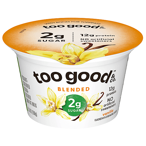 Doing good is about to become a whole lot more delicious with a Too Good & Co. Vanilla Banana Yogurt-Cultured Ultra-Filtered Low Fat Milk Product. Too Good & Co. is raising the bar on goodness with creamy taste and ingredients you feel good about. Every 5.3 oz serving of this yogurt-cultured dairy product is made with low fat ultra-filtered milk and is delightfully satisfying with 80 calories, 2g of total sugar and 12g of protein. Protein is an essential nutrient we need in our diets, and Too Good & Co. cups are great-tasting, convenient options for adding complete protein goodness every day. Too Good & Co. cups have at least 70% less sugar (2g per 5.3 oz) than average flavored and plain Greek yogurt (10g per 5.3 oz). Too Good & Co. low fat yogurt-cultured ultra-filtered milk makes a great addition to your breakfast and a delightful afternoon snack. Grab a pack for on the go snacks or pack a snack cup for a tasty pick-me-up whenever you need it. Invigorate your day with Too Good & Co. Yogurt-Cultured Ultra-Filtered Milk snack cups. *Not a low calorie food.
