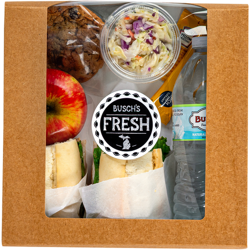 Our individually packaged boxed lunches include your choice of a fresh made sandwich (Classic Ham, Turkey, Roast Beef, or Vegetarian), a 4oz side salad (Coleslaw, Creamy Macaroni, or Yukon Gold Potato Salad), Busch's Natural Spring Water, an apple and a Busch's Fresh Baked Cookie. Minimum 10 Lunches per order. Please call store to inquire.