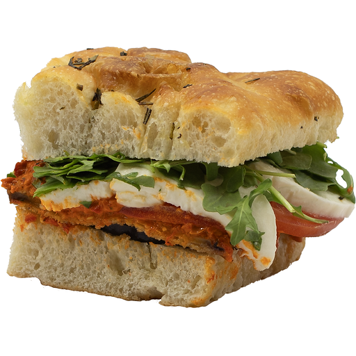 Urban Veggie Stack SandwichBreaded Eggplant, Fresh Mozzarella, Roasted Red Pepper Spread, on a Tomato Rosemary Focaccia.