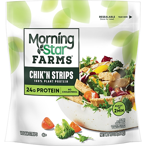 MorningStar Farms chik'n strips are lightly seasoned and a perfect meal starter for a variety of tasty recipes. Combine into your favorite stir-fry, add as a topping to your salad, or spice things up with some added protein to your fajitas. Batter, fry, saute, wrap, or toss these yummy meatless chicken strips into any meal. The possibilities are endless; These veggie strips provide an excellent source of protein (31% daily value) and are cholesterol free (contains 0.5g monounsaturated fat and 1.5g polyunsaturated fat per serving). MorningStar Farms chik'n strips are easy to prepare in the microwave or in the skillet. The resealable bag makes it easy to store in the freezer and use again when you're hungry for a quick lunch or dinner. Add your own seasonings for an extra kick of flavor. Sharing a meal with friends or enjoying a special occasion with loved ones, MorningStar Farms chik'n strips are sure to delight vegans, vegetarians, and meat-lovers alike.