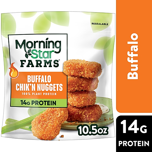 MorningStar Farms Buffalo chik'n nuggets are spicy and buffalo seasoned with a crispy, crunchy breading outside and tender inside. With 42% less fat than regular chicken nuggets*, these wings contain 14g protein (22% of daily value) and a good source of fiber (contains 8g total fat per serving). Stock this resealable bag in the freezer for an exciting anytime meal starter you can pair with your favorite dips, celery, or serve in a wrap; Whether you're looking for a winning snack to share with friends on game night, or just a quick and convenient lunch or dinner starter, MorningStar Farms Buffalo chik'n nuggets are a delicious choice sure to please meat-lovers and vegetarians alike. *Chicken nuggets contain 14g total fat per serving (94g). MorningStar Farms Buffalo Chik'n Nuggets contain 8g total fat per serving (94g).