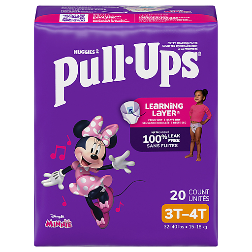 Start potty training with Pull-Ups Training Pants for Girls! Each training underwear delivers easy changes with refastenable sides, allowing you to keep pants and shoes on your toddler. Pull-Ups Potty Training Pants feature up to 100% leak-free protection and targeted absorbency where girls need it most. Made with soft and breathable materials, these girls’ training pants are comfy and flexible, with an underwear-like fit to help make potty training easy. Not only do they provide all-around coverage, but they also are designed for little hands to easily pull up and down for Big Kid independence. Each pack includes two exclusive music designs featuring Disney's Minnie Mouse, with instrument graphics that fade when wet to help motivate your child to stay dry. Making music with Minnie Mouse comes to life with interactive digital tools. When your child is ready to begin her potty training journey, the Pull-Ups brand can help. Visit the Pull-Ups website for expert potty training tips and resources. We've helped train 60 million Big Kids and counting!* Pull-Ups Girls' Training Underwear are available in sizes 2T-3T (16-34 lbs), 3T-4T (32-40 lbs), 4T-5T (38-50 lbs) and 5T-6T (50+ lbs). (*US and CA)