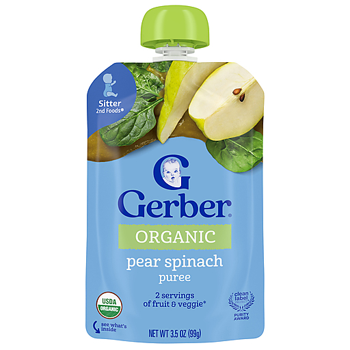 Our Gerber Organic Pear Spinach Puree Pouch is crafted with wholesome ingredients, making it a premium choice for your little one. This fruit and veggie pouch has 45% of the daily value of vitamin C and two servings* of fruit and veggie. These stage 2 Gerber baby food pouches are designed for babies who are ready to explore new textures and flavors, making them a great addition to your baby's diet. Gerber baby food understands the importance of providing wholesome food as your baby grows and develops. Our Gerber baby food fruit and veggies are ideal for parents who seek quality in their baby's diet.