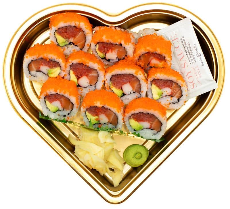 Tuna + Salmon + Avocado + Kani Roll, topped with Red Tobiko.